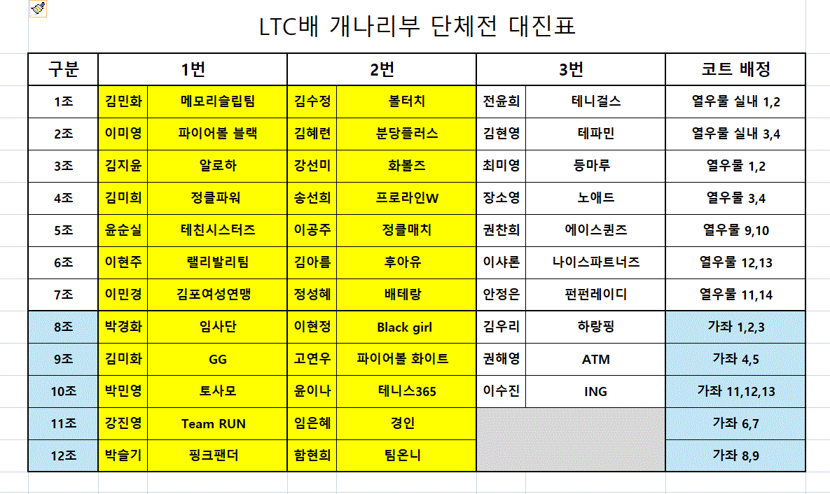 노란 표시된 팀은 8시40분까지 해당코트 진행본부로 출전신고 하시고 9시 정각에 게임 시작합니다.
