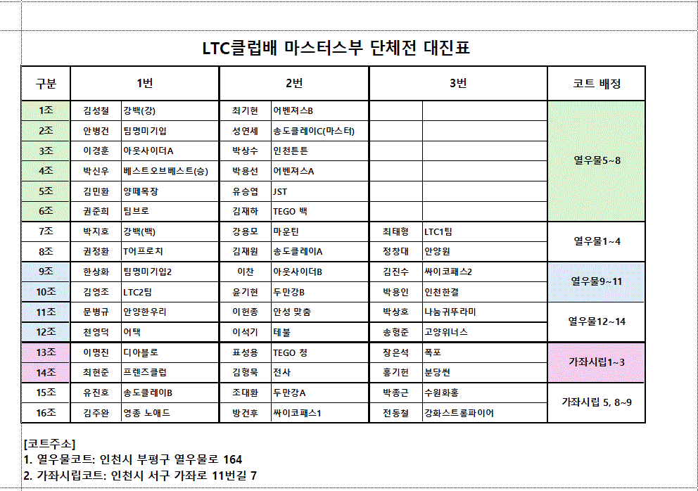 1) 열우물코트 및 가좌시립코트 배정팀들은 전원 12시30분까지 출전신고 및 예선 오더제출을 완료하여 주십시요.