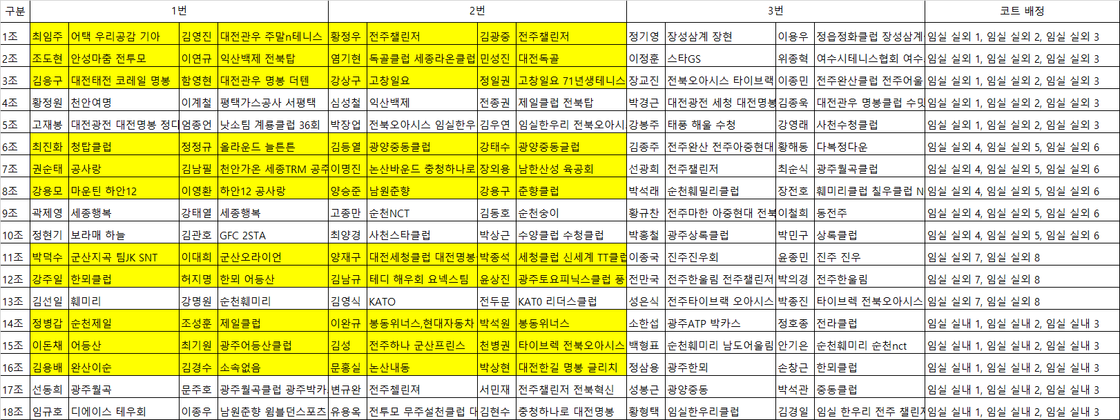 *패널티 : 노란색 표시 팀은 첫 경기입니다. 패널티가 적용되오니 꼭 8시 40분까지 경기장에 오셔서 출전 신고 하시기 바랍니다. 9시 정각에 경기 시작하오니 늦지 않도록 도착하시고, 점심시간을 따로 제공되지 않습니다.