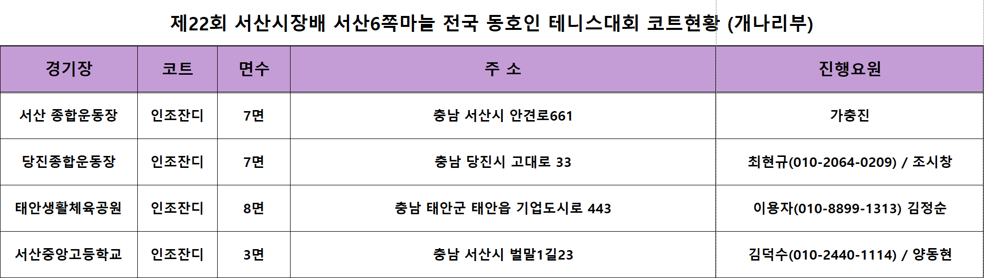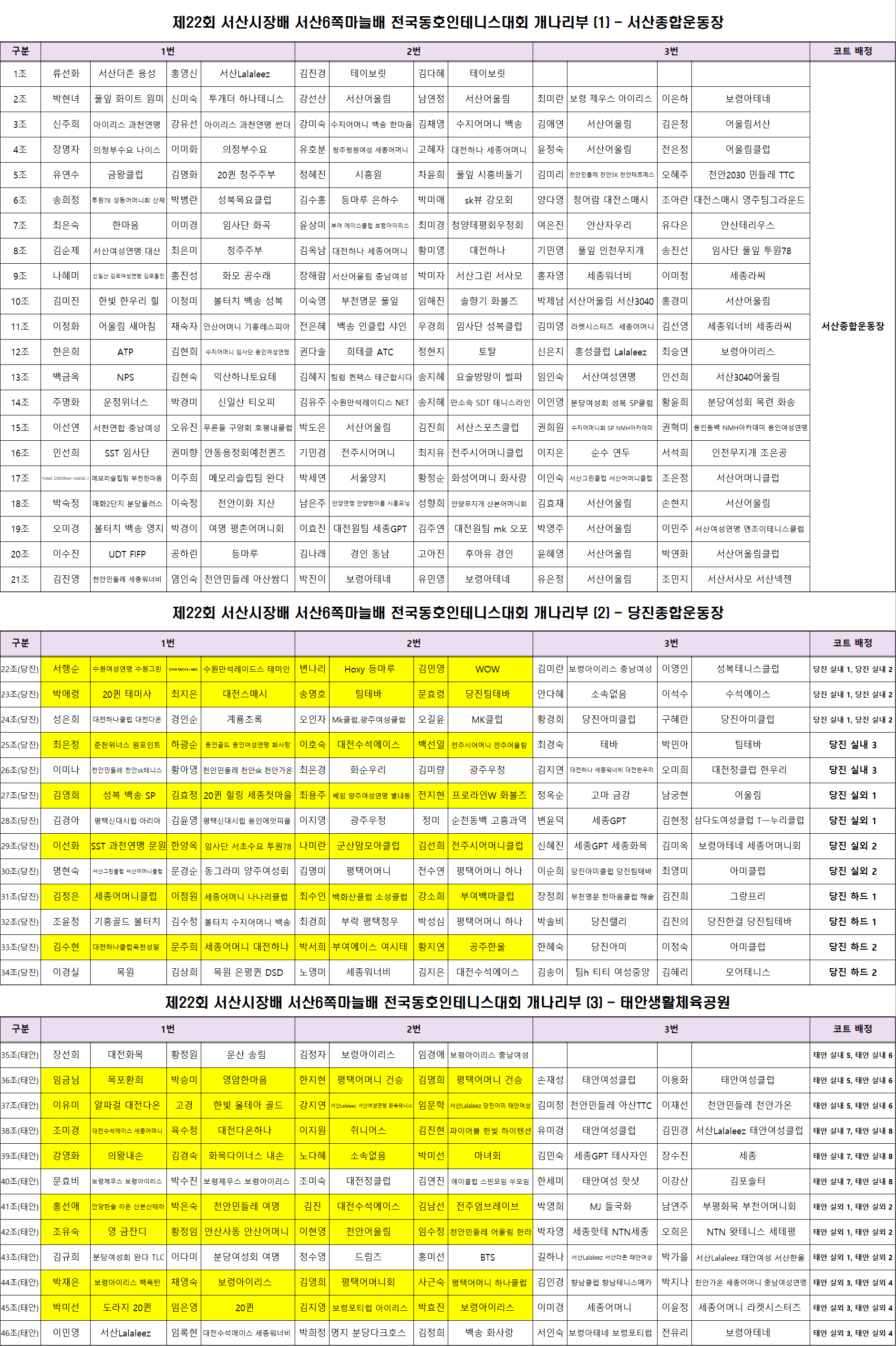 서산시장배 개나리부 대회 안내 및 코트배정입니다.서산종합운동장 코트배정 받으신분은 09시까지 출전신고 완료해주시고 당진 및 태안 코트배정 받으신 분 중 노란색 칠한 부분은 첫 게임 입니다.08시40분까지 출전신고 부탁 드리며 09시에 첫 경기입니다.페널티 적용 됩니다!!