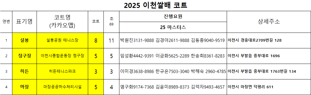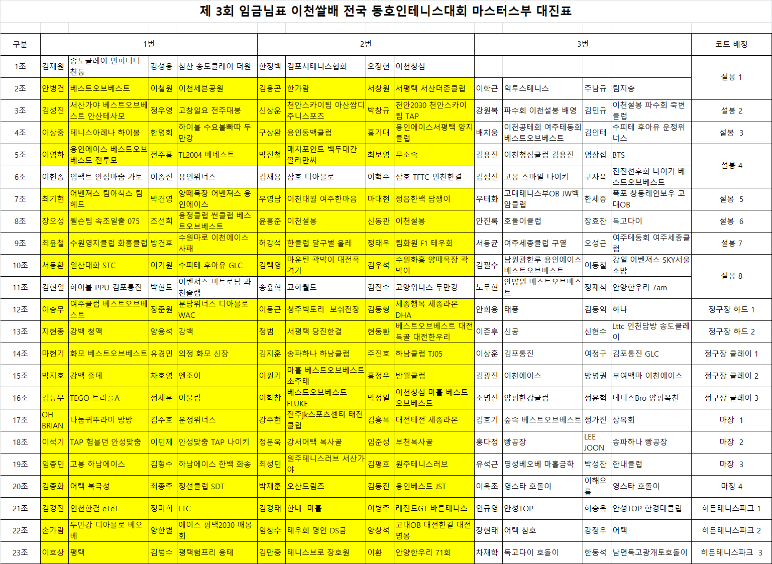 * 노란색 표시팀은 오전 08시 40분까지 해당코트에 출전신고 부탁드립니다.