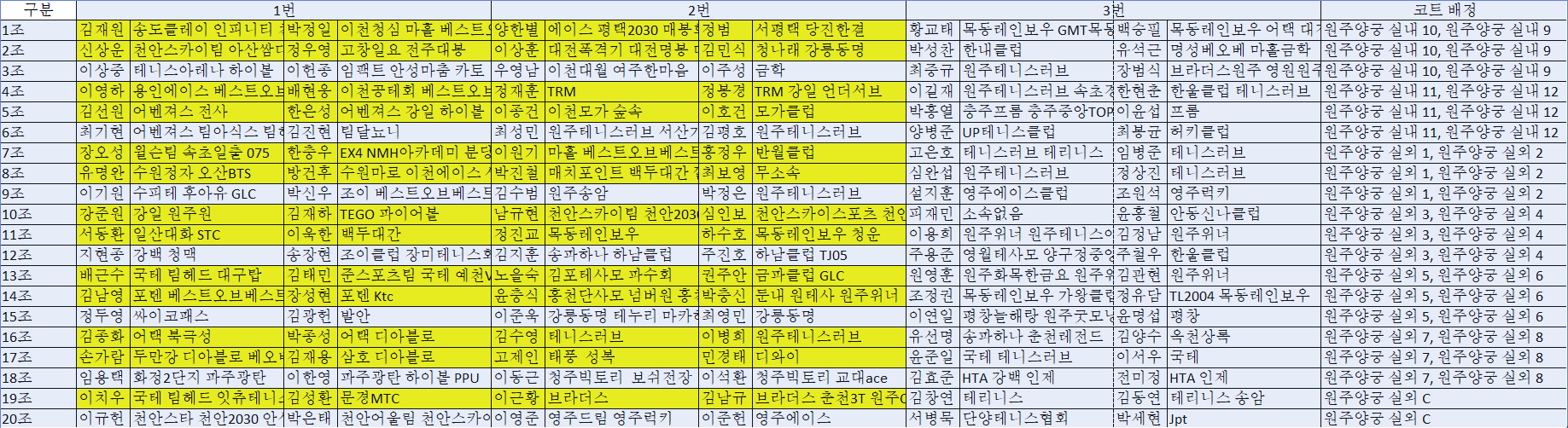 노란색 칠한 부분은 첫 게임 입니다. 08시40분까지 출전 신고 부탁 드리며