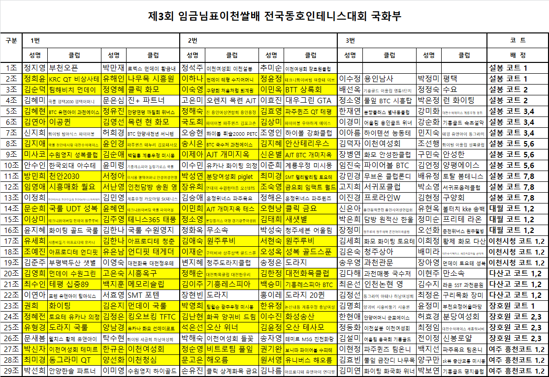 * 노란색 표시팀은 오전 08시 40분까지 해당코트에 출전신고 부탁드립니다.