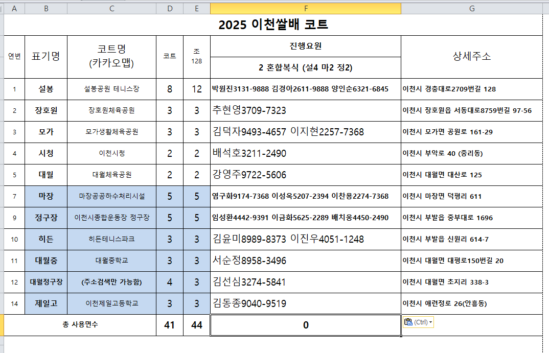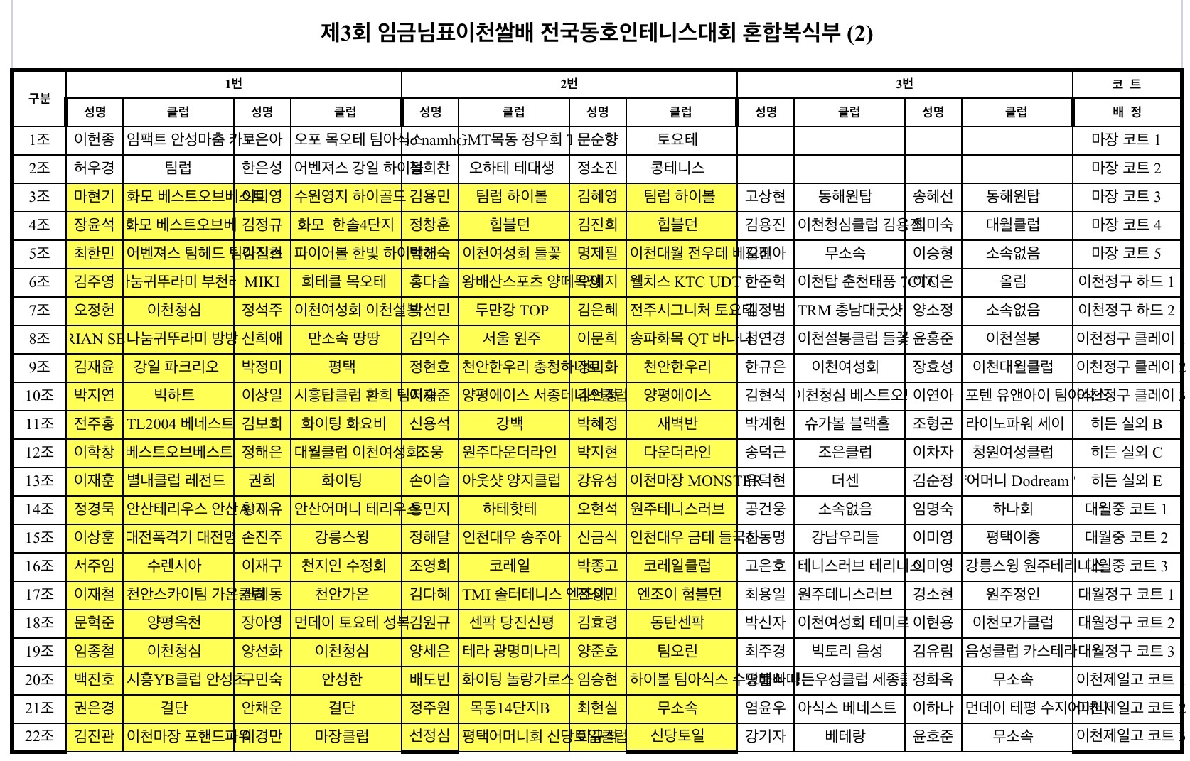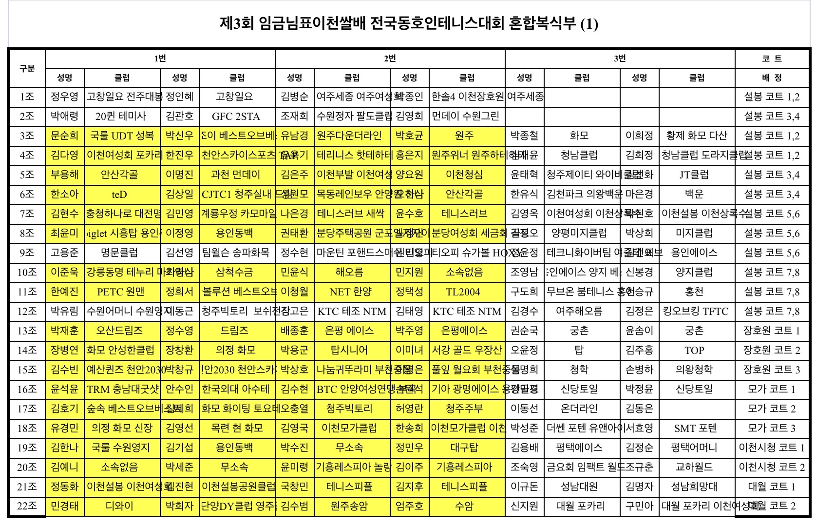 * 노란색 표시팀은 오전 08시 40분까지 해당코트에 출전신고 부탁드립니다.