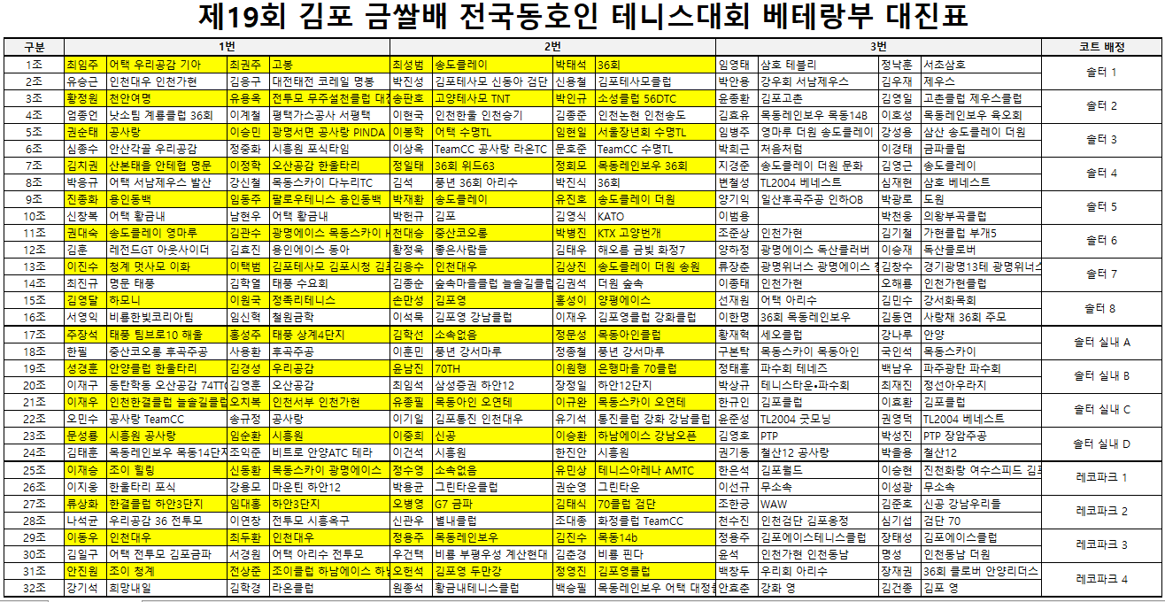 제19회 김포 금쌀배 전국동호인 테니스대회 베테랑부 대진표