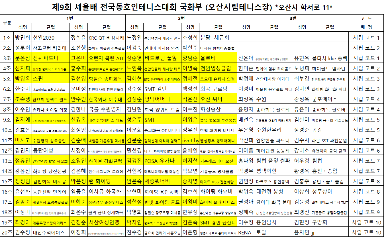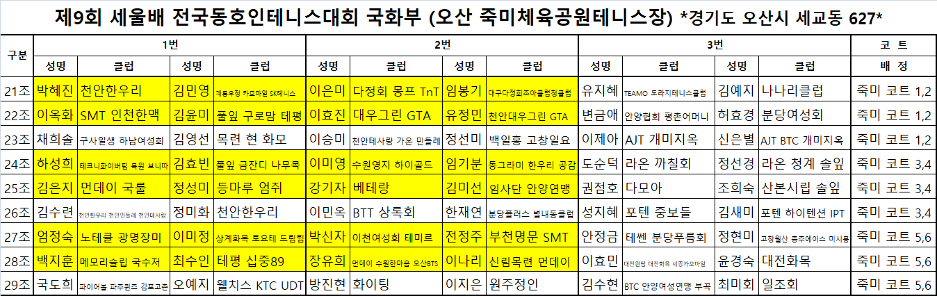 제9회 세울배 전국동호인테니스대회 "국화부" 오산코트 예선대진표입니다
