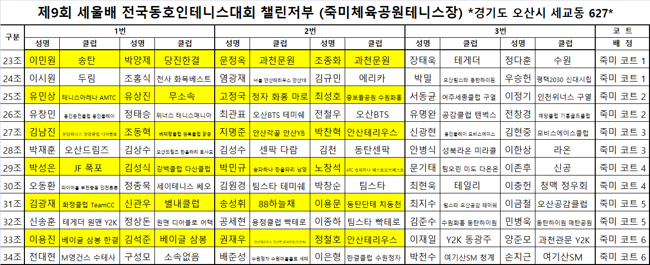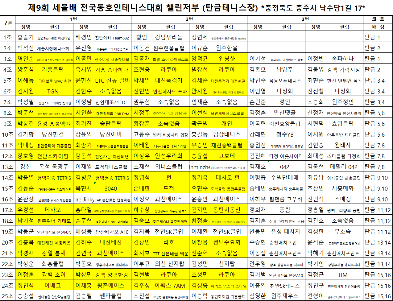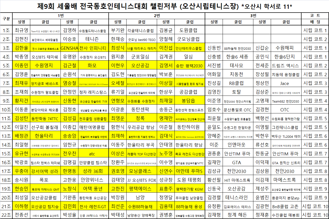 제9회 세울배 전국동호인테니스대회 "챌린저부" 오산(시립, 죽미)코트, 탄금코트 예선대진표입니다