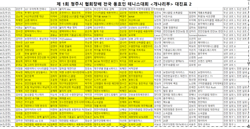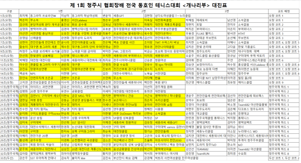 제1회 청주시테니스협회장배 전국동호인대회 개나리부 예선대진표(첨부파일참조)