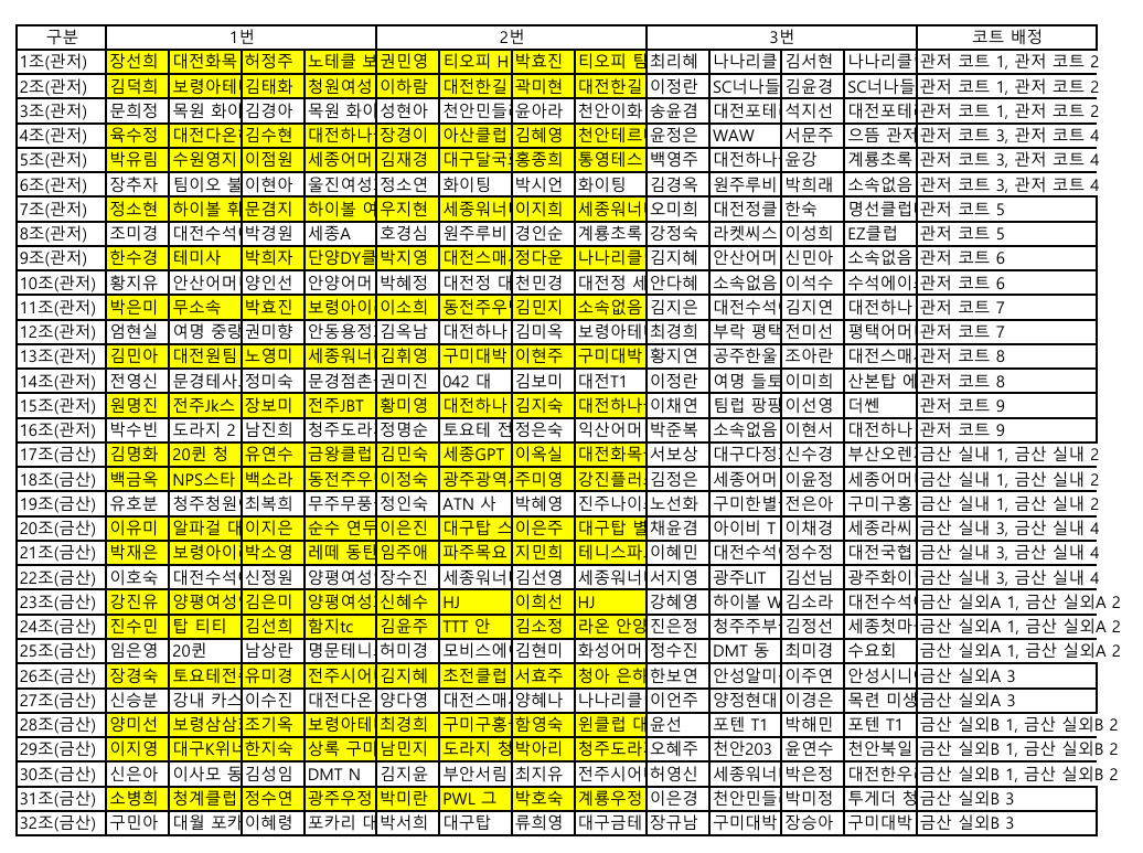 개나리부 대회 예선대진표 및 안내사항을 아래와 같이 공지드리오니 참고하셔서 다치지 않고 건강하게 즐기셨으면 좋겠습니다.