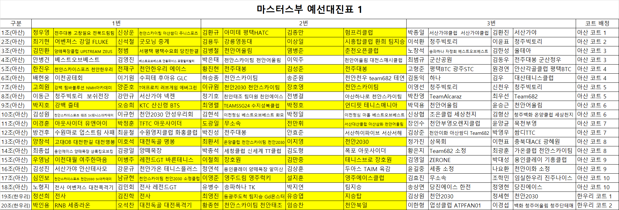 마스터스부 예선대진표를 다음과 같이 안내해 드립니다.