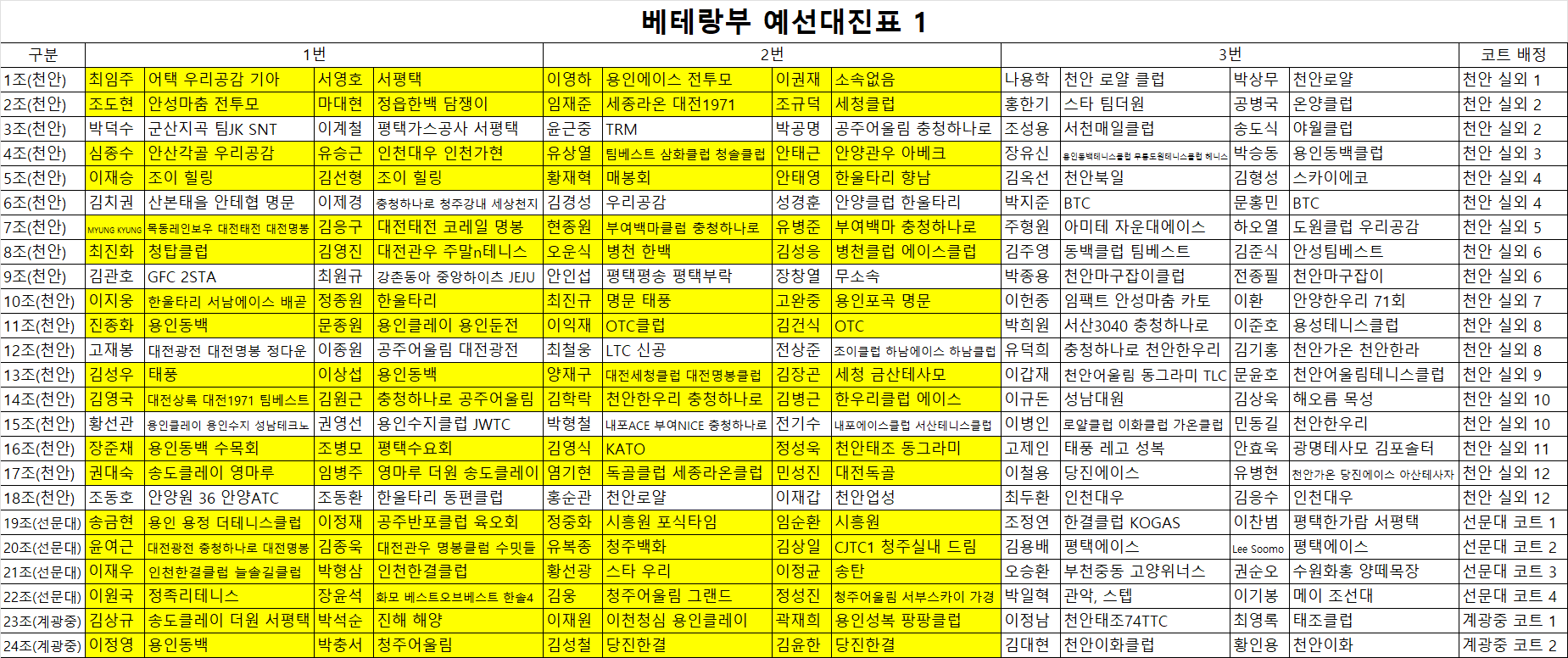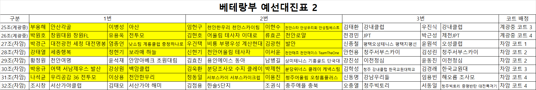 1. 노란색 표기는 첫번째 경기입니다.
