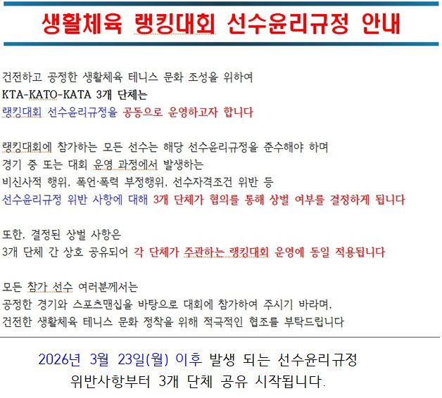 [공지] 생활체육 랭킹대회 선수윤리규정 안내