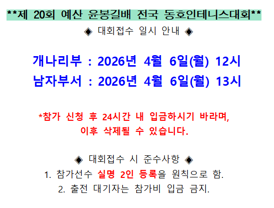 [대회접수공지] 제 20회 예산 윤봉길배 접수일자안내