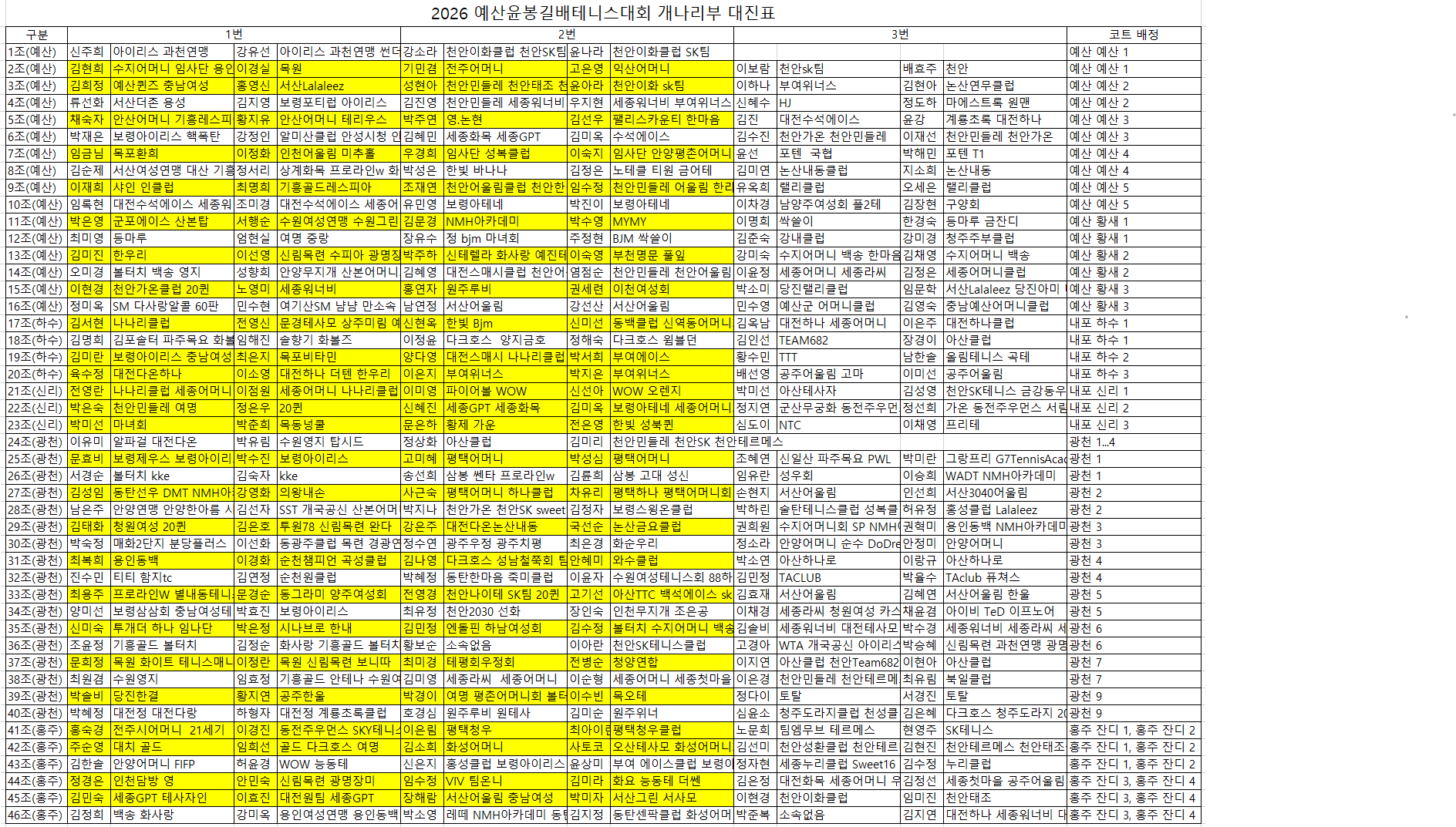 노란색 표기는 첫번째 경기입니다.